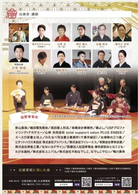 今回は能楽師の古室知也師(重要無形文化財保持者総合認定)をお招きしています。講師陣によるコラボもございます。三曲、日本舞踊、津軽三味線のコラボは大変珍しいものとなっています。